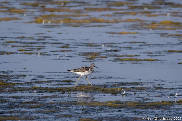 Selvom det kun er juni måned, så har sommerens fastboende i mosen allerede fået selskab af trækkende gæster. Her er enkelte hvidklirer og en 7-8 affældige brushaner, som har travlt med at æde sig i form igen oven på en hård ynglesæson, og nogle enkelte tinksmede er også dukket op.